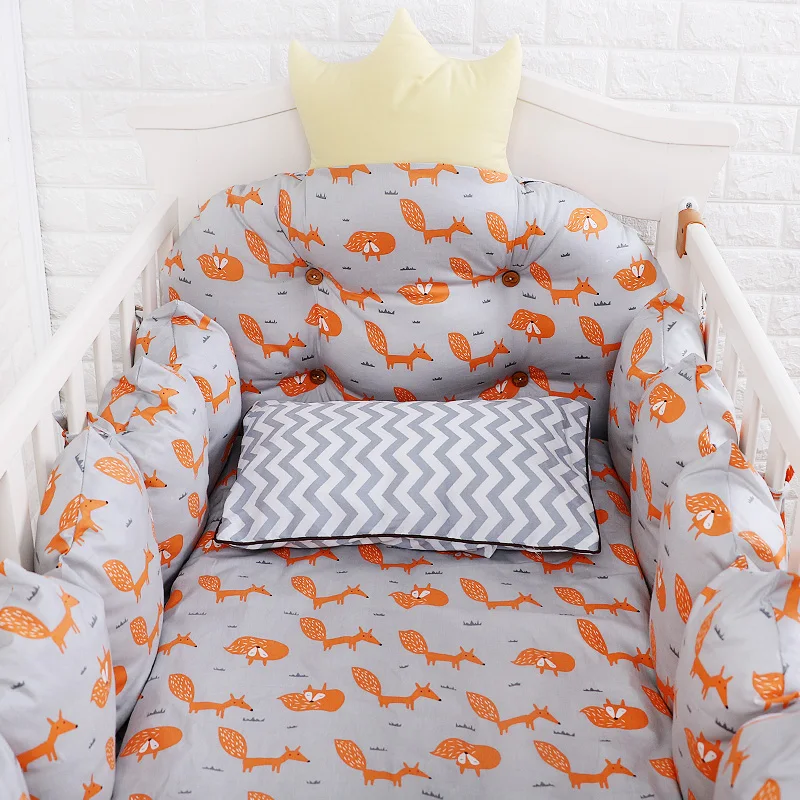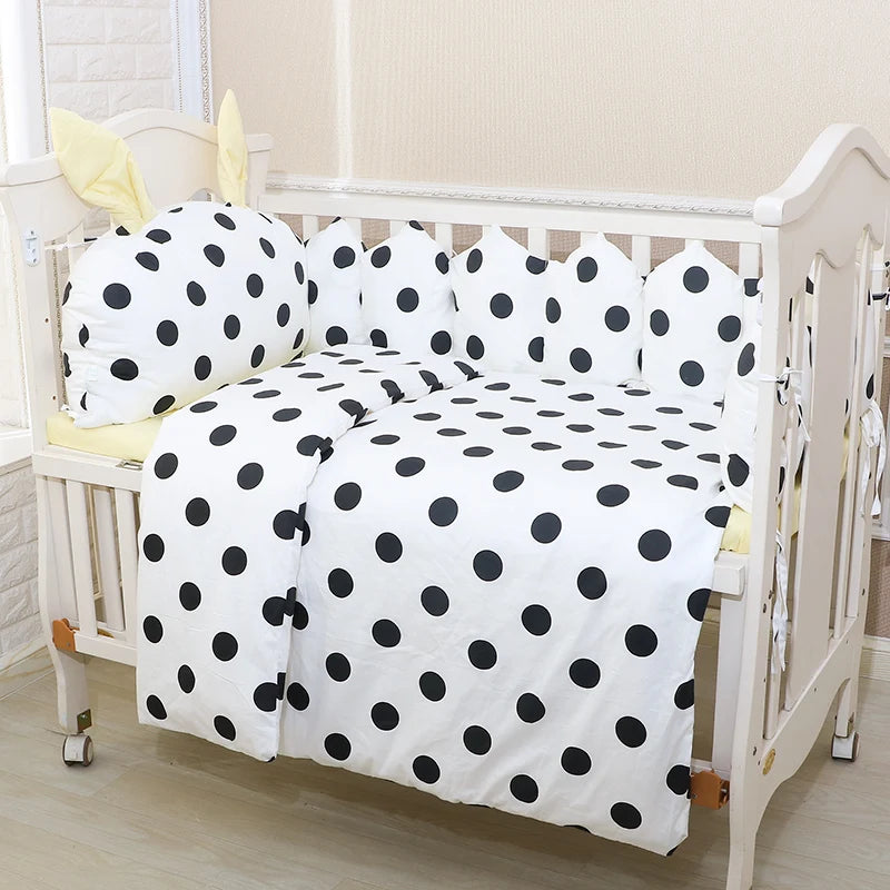 Soft, skin-friendly 100% cotton baby crib bedding set designed for comfort and safety. This 9-piece cartoon crib linen kit includes removable bumpers, a cozy quilt, pillow, and mattress cover.